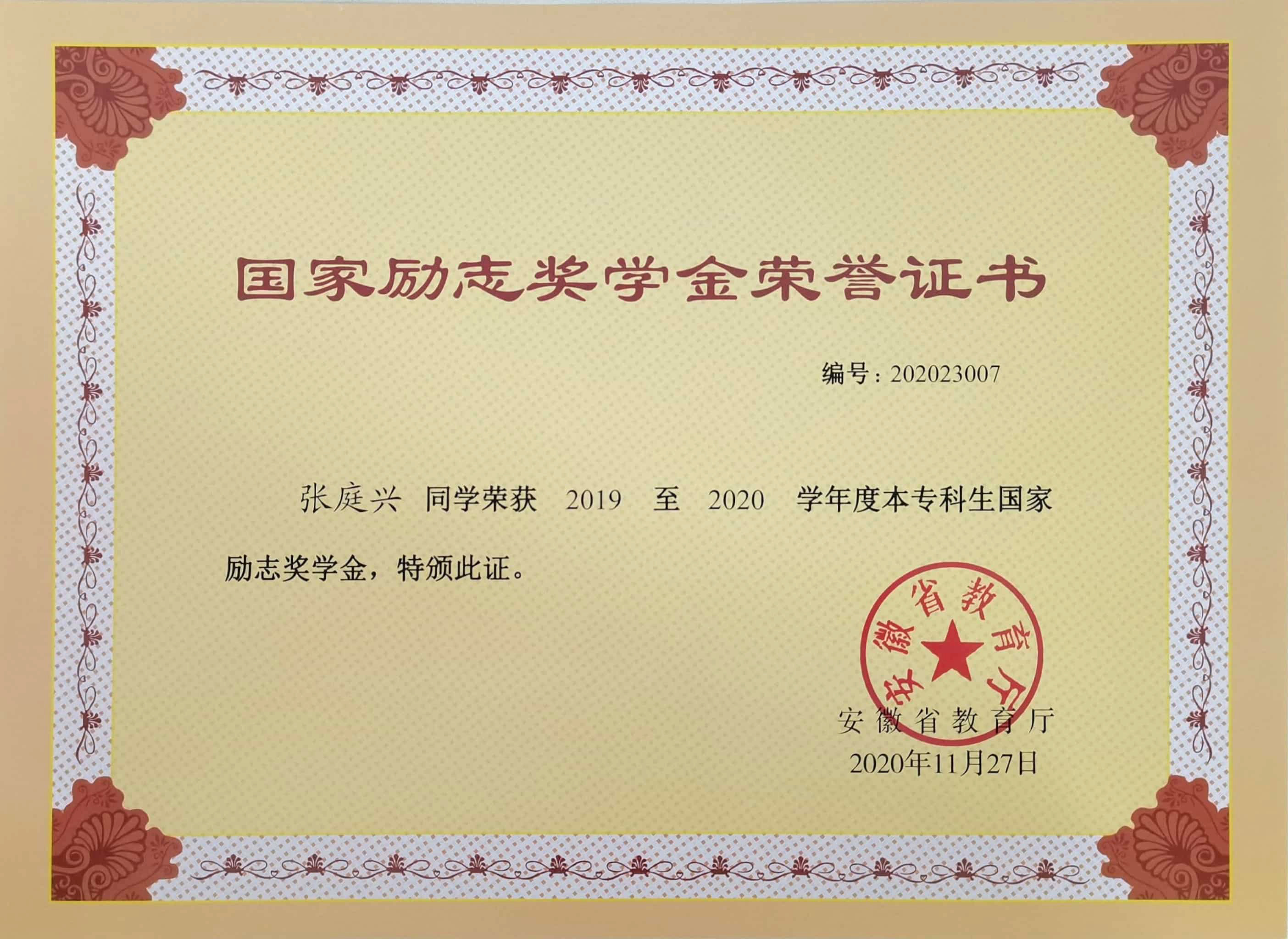荣获学校励志奖学金